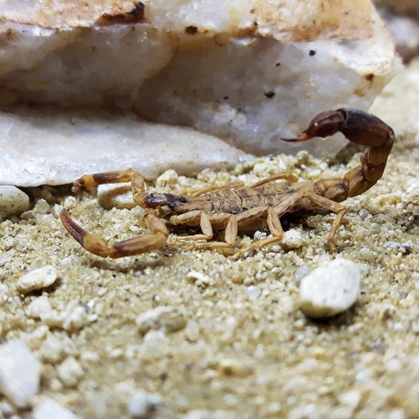 A small desert diorama with a big thick-tailed scorpion that lurks in a grasshopper.